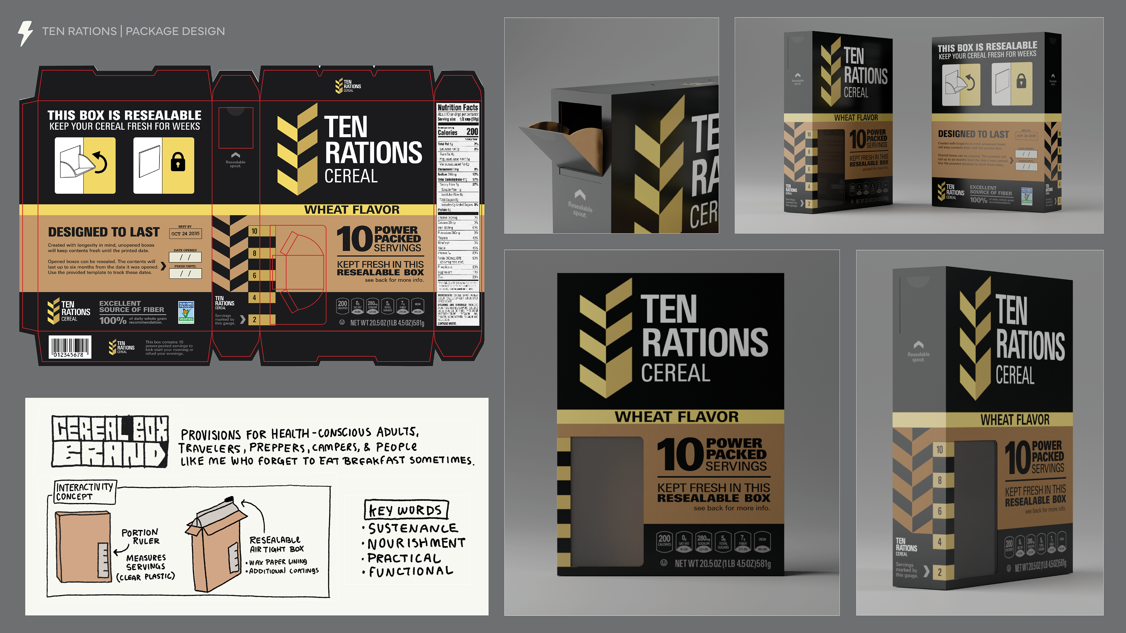 I created Ten Rations, a functional cereal brand designed for travelers, campers, and preppers. My goal with the packaging was to emphasize the brand's practicality and longevity. The box features a spout and a transparent cutout to track servings.
